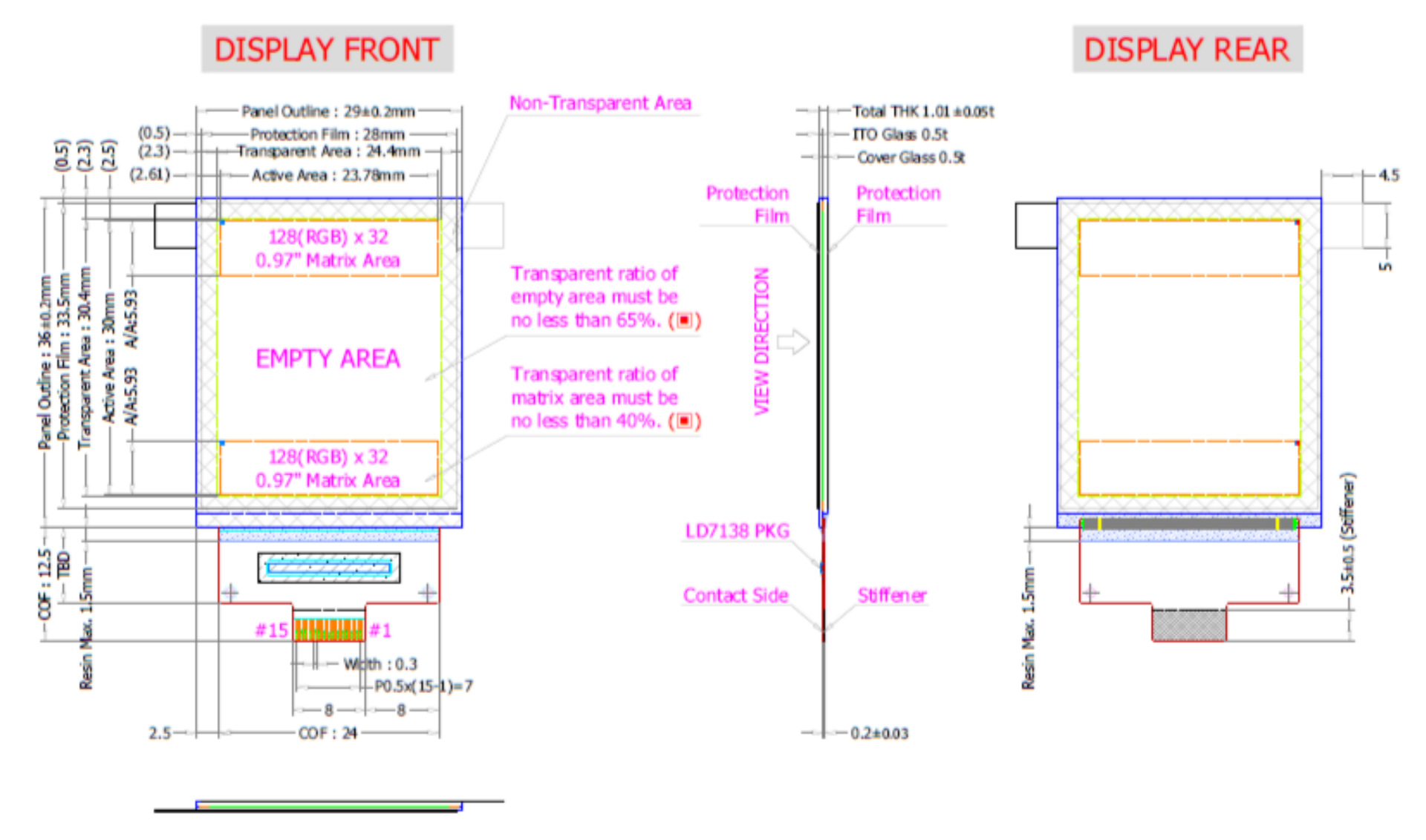 | Розміри | Панель 29.0×36.0 мм, прозора область 24.4 мм, активна область 23.78 мм, товщина 1.01 мм (±0.05t) |