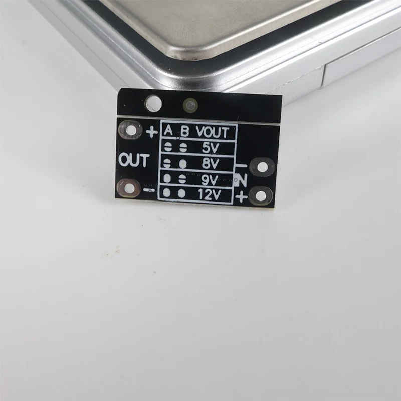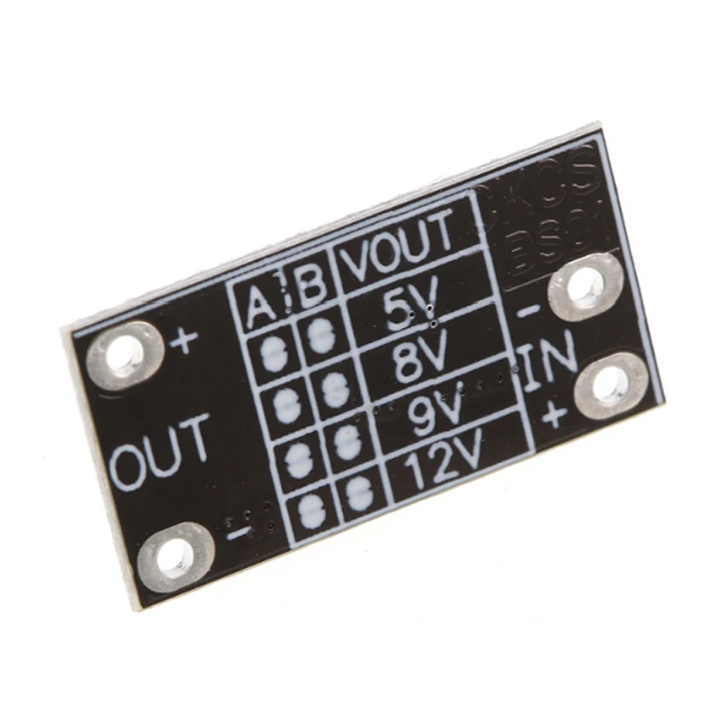 Четыре фиксированных напряжения через джамперы A и B устраняют потребность в дополнительных компонентах. По умолчанию модуль выдает 12V, но перепайка контактов дает 5V, 8V или 9V.